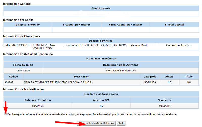 Luego debes confirmar los datos de tu dirección y presiona continuar, la página te mostrará un resumen de tu inicio de actividades, donde tendrás que declarar que la información contenida en el resumen es verídica, y por último presiona “efectuar inicio de actividades”.